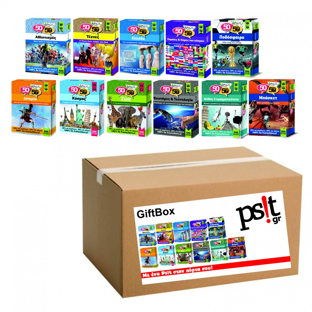 Πόσο καλά γνωρίζεις την Ελλάδα; Τέσταρε τις γνώσεις σου και συναγωνίσου τους φίλους σου με το νέο επιτραπέζιο ερωτήσεων 50-50 Κουίζ Ελλάδα! Με 600 ερωτήσεις που καλύπτουν ποικίλα θέματα, μαθαίνεις τις πιο ενδιαφέρουσες και αξιοπερίεργες πληροφορίες. Κανόνες: Ρίξε το ζάρι και απάντησε στην ερώτηση. Αν απαντήσεις σωστά, κράτησε την κάρτα. Αν απαντήσεις λάθος, βάλε την κάρτα πίσω στη θέση της. Μάζεψε όσες περισσότερες κάρτες μπορείς και γίνε ο νικητής! Περιεχόμενα: 100 κάρτες, 1 ζάρι Διαστάσεις κάρτας: 5,7 x 8,9 εκ. Διαστάσεις κουτιού: 17 x 12 x 3,5 εκ.