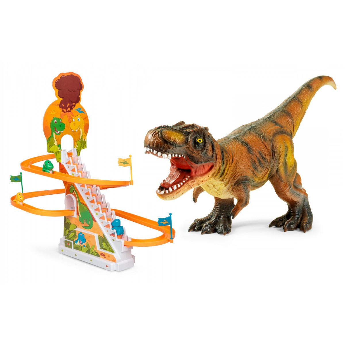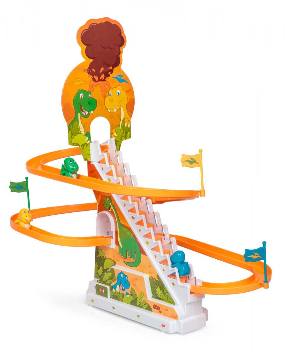 Τοποθέτησε τους μικρούς δεινόσαυρους στην σκάλα και δες τους να την ανεβαίνουν, να περνούν κάτω από το ηφαίστειο και τσούπ να γλιστρούν ένας ένας στην στριφογυριστή τσουλήθρα τερματίζοντας στην αρχή της σκάλας έτοιμοι να το ξανακάνουν!