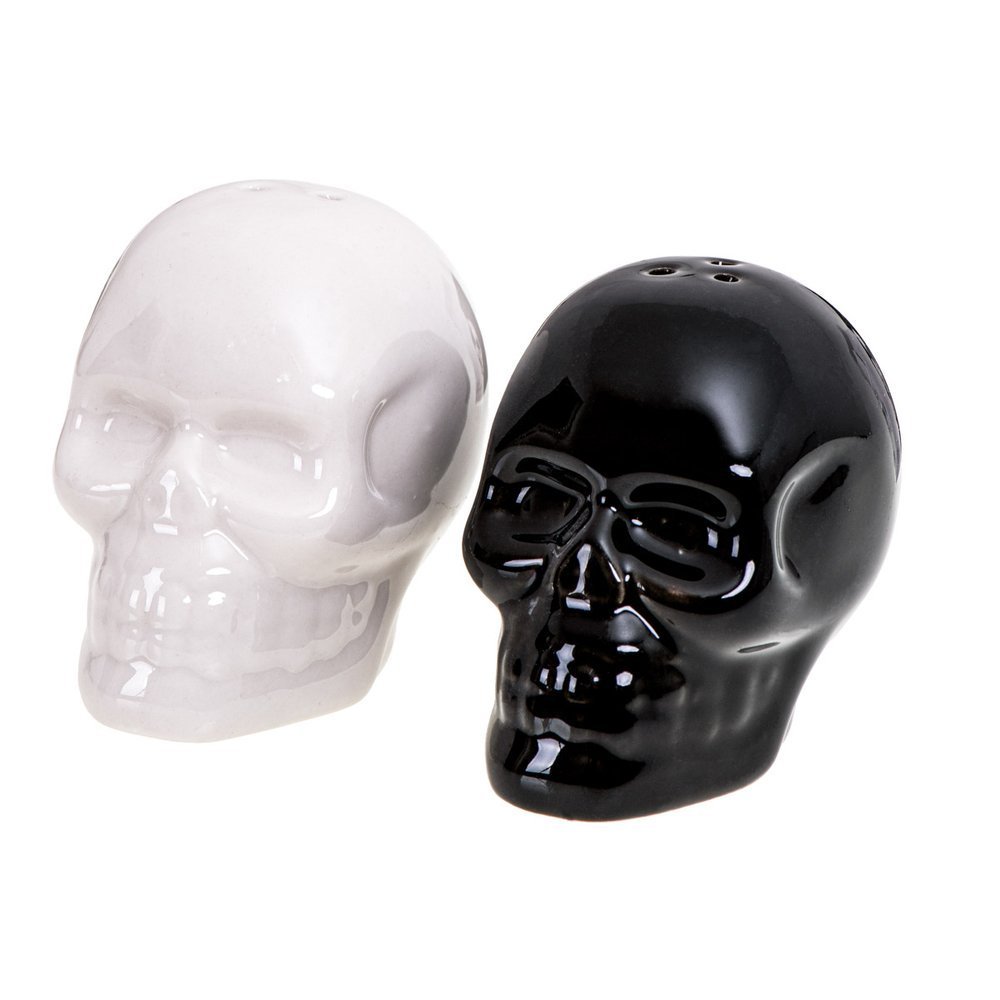 Ξέχνα την κλασική αλατιέρα και πιπεριέρα. Βάλε αλάτι και πιπέρι όχι μόνο στο τραπέζι, αλλά και στη ζωή σου! Το σετ αλατοπίπερο σε σχήμα νεκροκεφαλής έρχεται να προκαλέσει ρίγη τρόμου και θαυμασμού, και να συμπληρώσει με ιδιαίτερο τρόπο τα καθημερινά χρηστικά σου αντικείμενα.