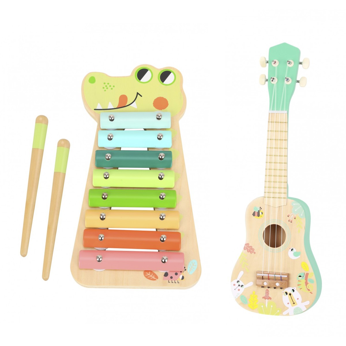 Αυτό το ξύλινο μουσικό μεταλλόφωνο με κλακέτες προσφέρει ποικίλα αισθητηριακά ερεθίσματα και είναι κατάλληλο για παιδιά 18 μηνών και άνω. Αποτελείται από όμορφα και ζωηρά χρώματα που κεντρίζουν το βλέμμα του παιδιού καλλιεργώντας την οπτική αντίληψή του. Επιπλέον, του δίδεται η δυνατότητα να αντιληφθεί τους ήχους και τις νότες και να αναπτύξει έτσι την ακουστική του ικανότητα. Επίσης, βελτιώνει τις μουσικές δεξιότητές του με την παραγωγή της μουσικής τόσο του μεταλλόφωνου όσο και των κλακετών και ταυτόχρονα του δίνει τη δυνατότητα να δημιουργήσει και να παράγει τους δικούς του μουσικούς τόνους και ρυθμούς. Έτσι, η μουσική δημιουργικότητα του παιδιού μπορεί να αναπτυχθεί και να καλλιεργηθεί μέσω αυτού του μοναδικού ξύλινου μουσικού μεταλλόφωνου με κλακέτες.