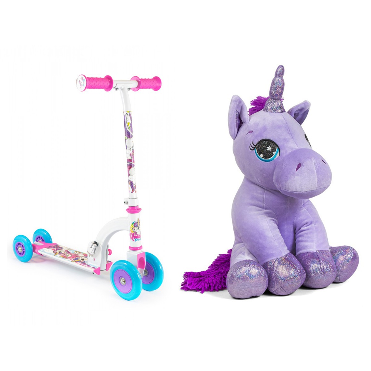 Ένα πτυσσόμενο τετράτροχο πατίνι με σχέδια μονόκερων και όμορφα χρώματα του λευκού, του ροζ και του μπλε που είναι ιδανικό για αρχάριους και μικρά παιδιά. Αποτελείται από το πτυσσόμενο τιμόνι, που προσαρμόζεται στο ύψος κάθε παιδιού, δύο μπροστινές ρόδες και δύο στο πίσω μέρος του στις οποίες είναι ενσωματωμένο το φρένο. Η σταθερότητα των τεσσάρων τροχών είναι ιδανική για παιδιά που θέλουν να μάθουν πώς να κάνουν σκούτερ. Επίσης, μπορεί να μετατραπεί και σε δίτροχο πατίνι χρησιμοποιώντας το για μεγαλύτερο χρονικό διάστημα. Ο άξονάς του είναι ειδικά σχεδιασμένος να αντέχει το βάρος προσφέροντας την αίσθηση της ασφάλειας και της σταθερότητας. Είναι κατασκευασμένο από ανοξείδωτο αλουμίνιο και πολυουρεθάνη και αναδιπλώνεται για εύκολη αποθήκευση και μεταφορά. Το παιδί με τη βοήθεια του πατινιού-scooter αναπτύσσει τις κινητικές του δεξιότητες, τον συντονισμό του σώματός του και βελτιώνει την ισορροπία και την ευκινησία του. Παράλληλα, γυμνάζει όλο το σώμα του. Τέλος, μπορεί να χρησιμοποιηθεί και ως εναλλακτικός τρόπος μετακίνησης για κοντινές αποστάσεις.