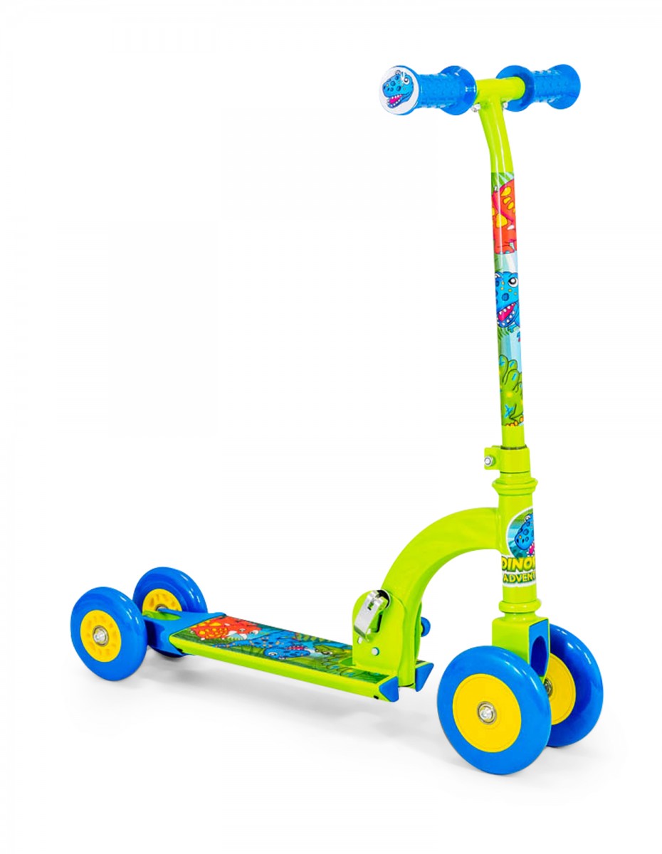 Ένα πτυσσόμενο τετράτροχο πατίνι με σχέδια δεινόσαυρων και όμορφα χρώματα του πράσινου και του μπλε που είναι ιδανικό για αρχάριους και μικρά παιδιά. Αποτελείται από το πτυσσόμενο τιμόνι, που προσαρμόζεται στο ύψος κάθε παιδιού, δύο μπροστινές ρόδες και δύο στο πίσω μέρος του στις οποίες είναι ενσωματωμένο το φρένο. Η σταθερότητα των τεσσάρων τροχών είναι ιδανική για παιδιά που θέλουν να μάθουν πώς να κάνουν σκούτερ. Επίσης, μπορεί να μετατραπεί και σε δίτροχο πατίνι χρησιμοποιώντας το για μεγαλύτερο χρονικό διάστημα. Ο άξονάς του είναι ειδικά σχεδιασμένος να αντέχει το βάρος προσφέροντας την αίσθηση της ασφάλειας και της σταθερότητας. Είναι κατασκευασμένο από ανοξείδωτο αλουμίνιο και πολυουρεθάνη και αναδιπλώνεται για εύκολη αποθήκευση και μεταφορά. Το παιδί με τη βοήθεια του πατινιού-scooter αναπτύσσει τις κινητικές του δεξιότητες, τον συντονισμό του σώματός του και βελτιώνει την ισορροπία και την ευκινησία του. Παράλληλα, γυμνάζει όλο το σώμα του. Τέλος, μπορεί να χρησιμοποιηθεί και ως εναλλακτικός τρόπος μετακίνησης για κοντινές αποστάσεις.