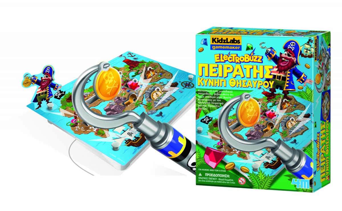 Κατασκευάστε ένα μοναδικό επιτραπέζιο παιχνίδι, αλλά βεβαιωθείτε πρώτα ότι έχετε σταθερό χέρι! Βρείτε τους θησαυρούς και προσπαθήστε να τους σηκώσετε με τον ηλεκτρικό πειρατικό γάντζο. Προσέξτε, βουίζει! ΤΡΟΠΟΣ ΛΕΙΤΟΥΡΓΙΑΣ: Το άκρο του ραβδιού είναι κατασκευασμένο από μια κεντρική ακίδα με ένα ελατήριο γύρω της. Η μπαταρία, ο διακόπτης, το μπάζερ (μέσα στη βάση), το καρφίτσωμα και το ελατήριο συνδέονται μεταξύ τους για να δημιουργήσουν ένα ηλεκτρικό κύκλωμα. Το ραβδί λειτουργεί σαν ένας επιπλέον διακόπτης στο κύκλωμα. Όταν αγγίζετε τις πλευρές της ράγας με το ραβδί, το ελατήριο κάμπτει και αγγίζει την καρφίτσα. Αυτό ολοκληρώνει το κύκλωμα, έτσι ώστε το ηλεκτρικό ρεύμα να περνάει μέσα από το μπάζερ και να λειτουργεί. Περιέχονται οδηγίες στα Ελληνικά.