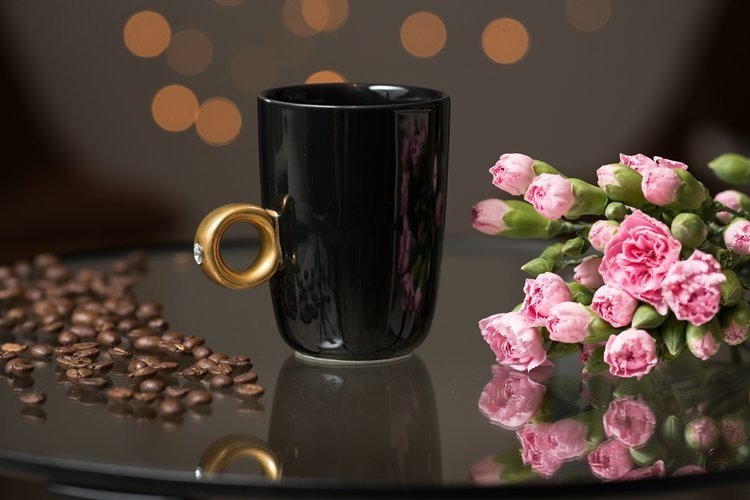 Η κούπα είναι κεραμική σε μαύρο χρώμα με χειρολαβή μονόπετρο-δαχτυλίδι.