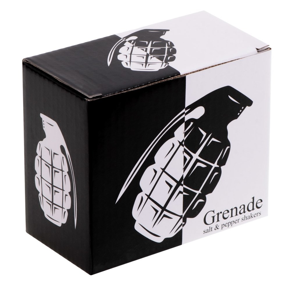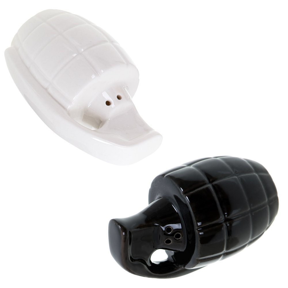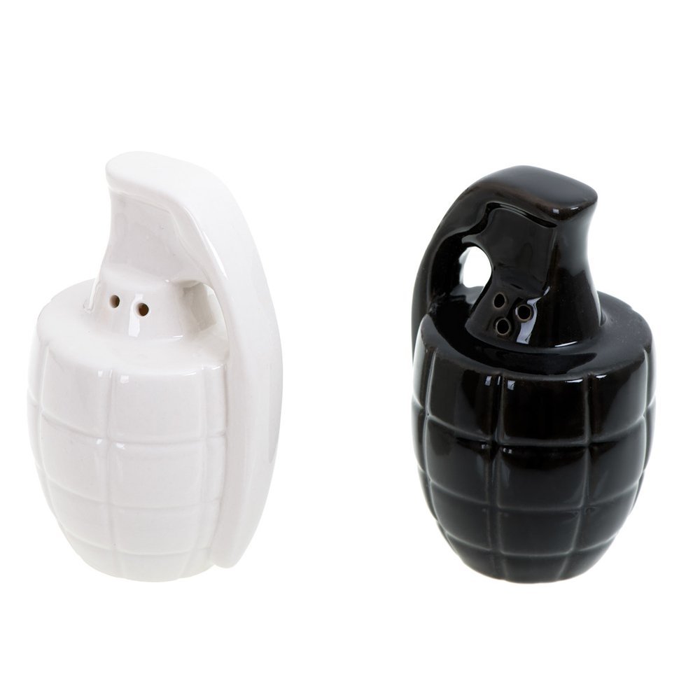 Ξέχνα την κλασική αλατιέρα και πιπεριέρα. Βάλε αλάτι και πιπέρι όχι μόνο στο τραπέζι, αλλά και στη ζωή σου! Το σετ αλατοπίπερο σε σχήμα χειροβομβίδας έρχεται να προκαλέσει ρίγη τρόμου και θαυμασμού, και να συμπληρώσει με ιδιαίτερο τρόπο τα καθημερινά χρηστικά σου αντικείμενα.