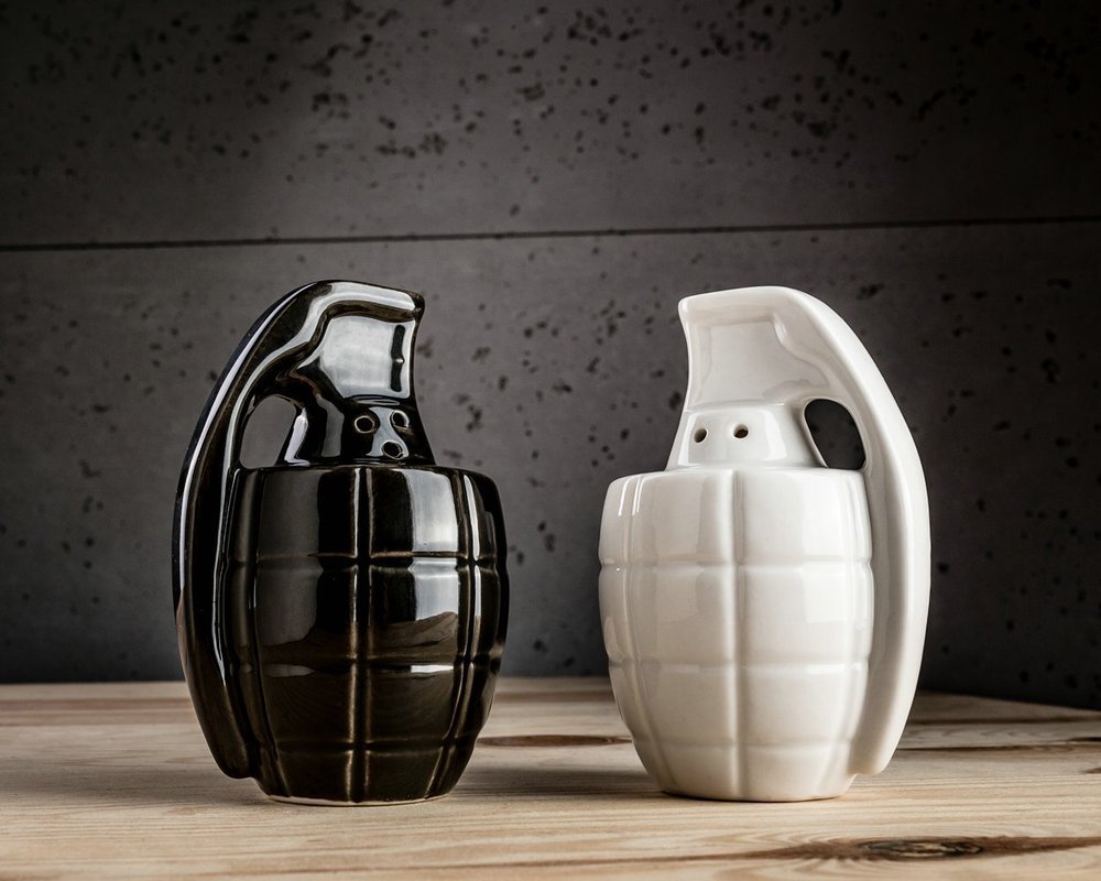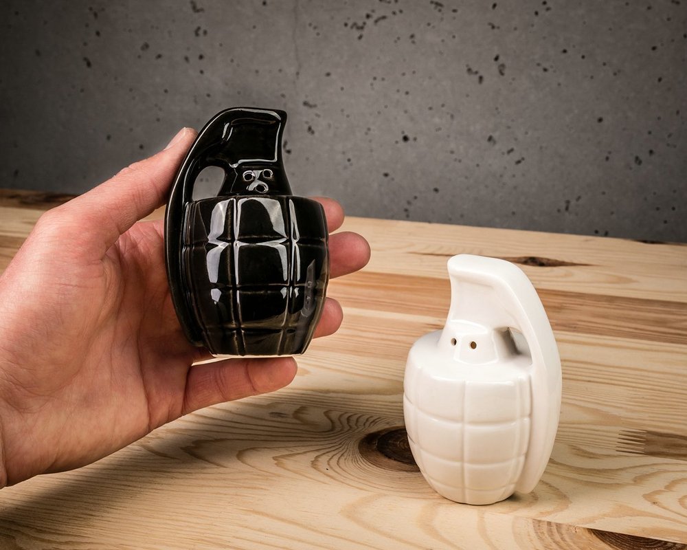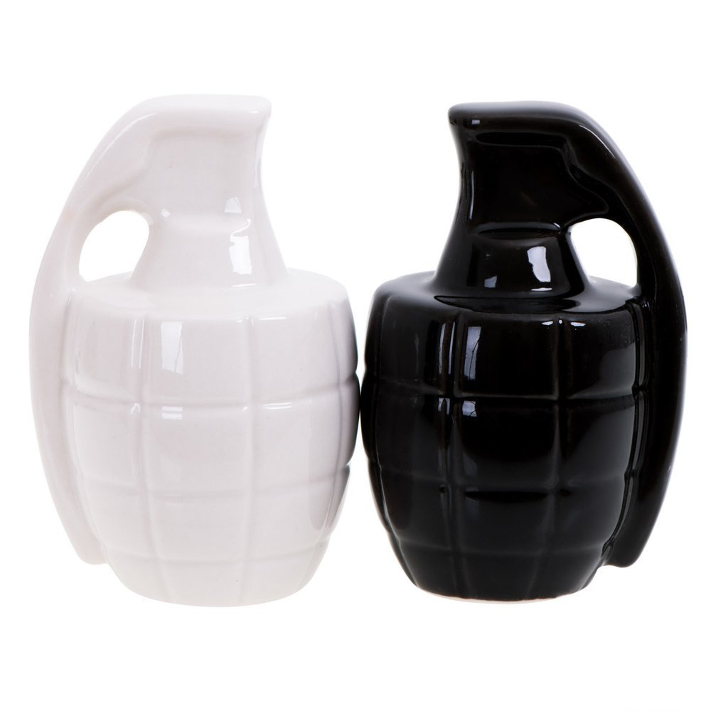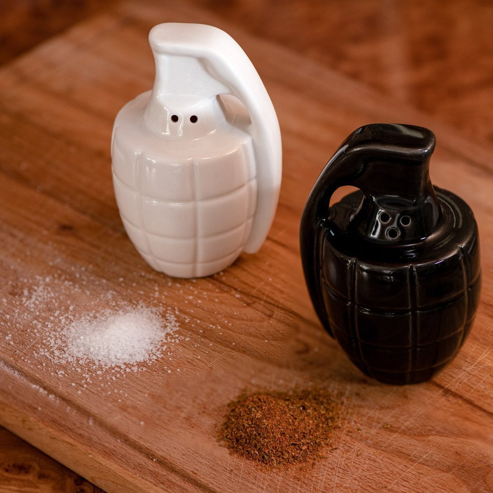 Ξέχνα την κλασική αλατιέρα και πιπεριέρα. Βάλε αλάτι και πιπέρι όχι μόνο στο τραπέζι, αλλά και στη ζωή σου! Το σετ αλατοπίπερο σε σχήμα χειροβομβίδας έρχεται να προκαλέσει ρίγη τρόμου και θαυμασμού, και να συμπληρώσει με ιδιαίτερο τρόπο τα καθημερινά χρηστικά σου αντικείμενα.